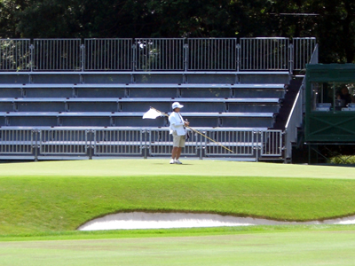 トーナメントでのキャディが初めてという方に多い勘違いは、先にパッティングをする選手のキャディがピンを抜かなければならないと思っていることと、ピンはグリーンの外に置くものだと思っていること。