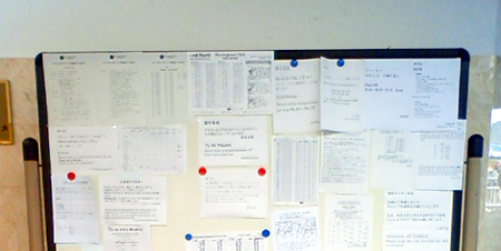 ホワイトボードにお知らせ等の書類が貼られているという単純なものなのですが、最終日が近づくにつれて貼られる書類は増えていき、最後にはぎっしりと情報が貼られます。
