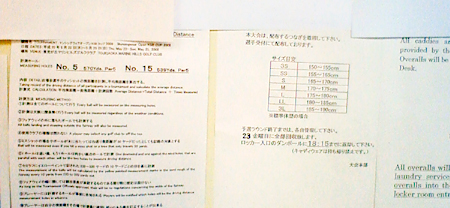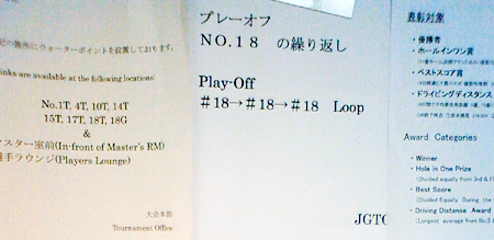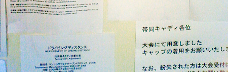 初日の段階で貼られているものは、大会の実施要綱やちょっとしたお知らせぐらいですが、その内に練習場や練習グリーンの規定の場所、ペアリング、成績表、ドライビングディスタンスの結果、特別ルール、コースの避難経路、飲み物が置いてある場所の表示、カートに乗る場所等々様々な書類が追加されていきます。
