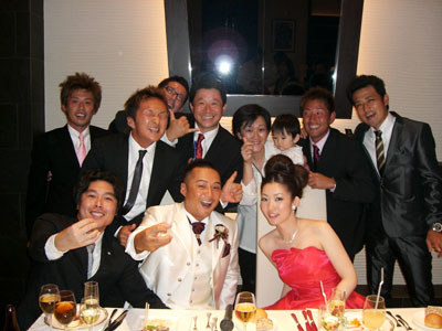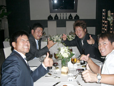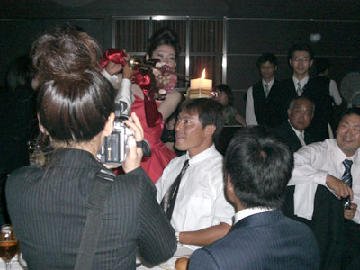場所は名古屋。 休みの間は全国各地に散らばっている選手、キャディは、披露宴に出席するため飛行機や新幹線を利用して続々と集まってきます。 披露宴の途中、新婦がおめしかえのために中座するとそれを待っていたかのように選手の周りには写真やサインを求めるお客様がよってきて自然と人だかりができます。 キャディはというと、そんな選手を「大変だねー。」と思いながらも、あまり気にせずお気楽に歓談。 結婚式に限らずこういったパーティのような形式のときは、キャディの集まる場所が関係者の憩いの場になることは少なくありません。 最近はタバコに対するイメージがあまり良くないので、タバコを吸う選手は吸いたくなるとキャディの集まる場所にコソコソとやって来て一服ということもあります。